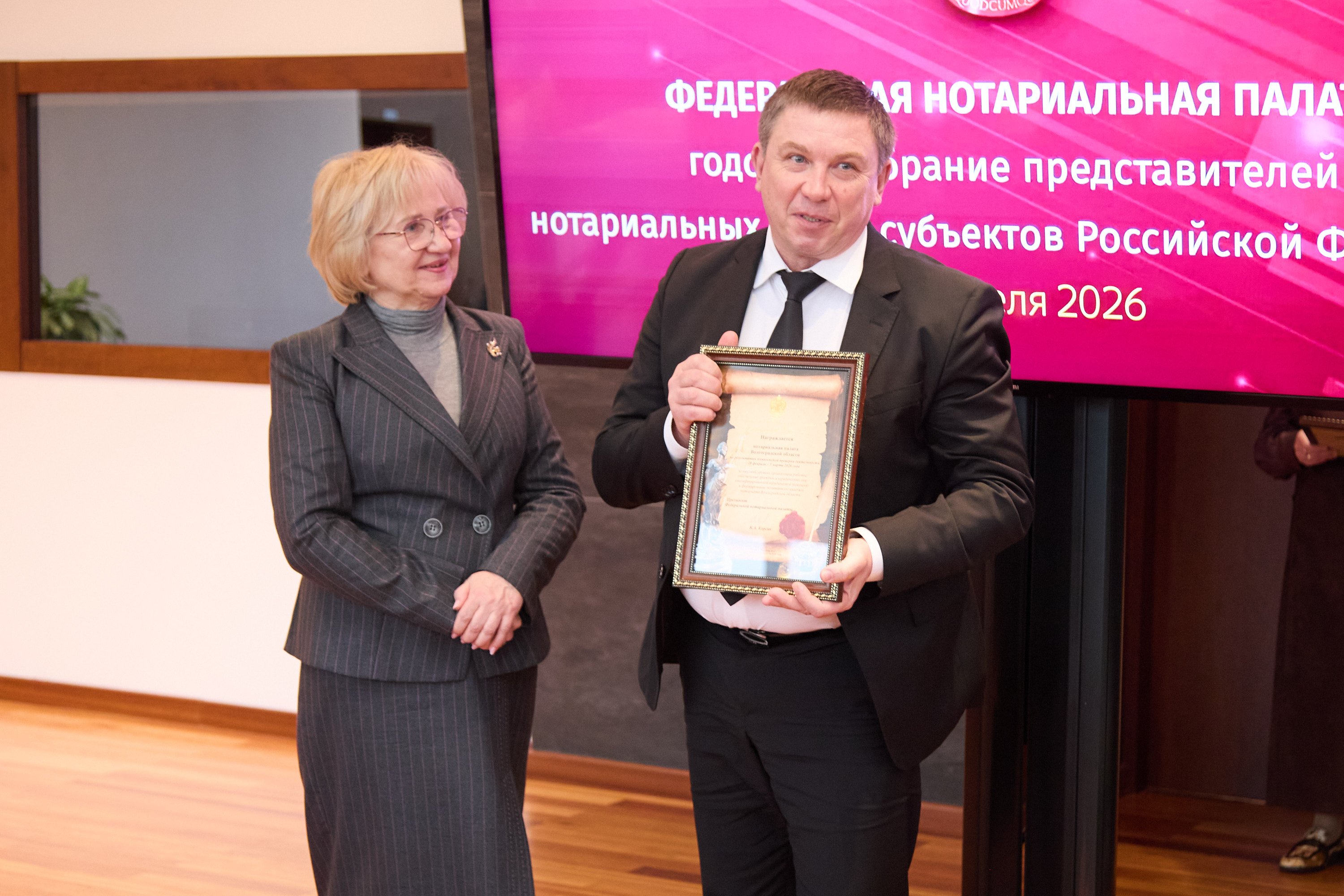 По результатам комплексной проверки организации деятельности Почетной грамотой ФНП была награждена Московская городская нотариальная палата. Медалью Анатолия Тихенко за большой личный вклад в развитие нотариата г. Москвы был награжден президент МГНП Константин Корсик.